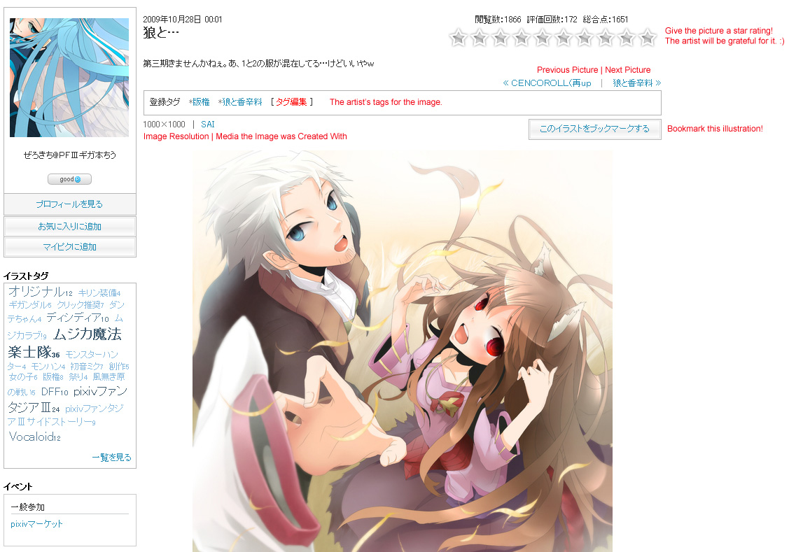 Step 1. Above I have a typical illustration page. Every image on Pixiv has tags displayed right above it. These tags make it easy to search. This picture is tagged “Copyright” (which means it is a fanart) and “Spice and Wolf” (the name of the series the characters in the picture are from). There’s also a row of stars on the top right. You can click on the stars to give the picture a rating if you’d like to. Now, this picture is soooo cute, I want to add it to my bookmarks, so I click the “Bookmark this Illustration” link in the box that sits on the top right of the image.