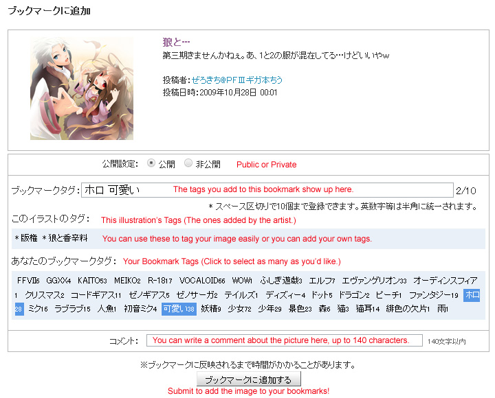 Step 2b. There’s a text field where you can type in tags manually (separated by spaces) or if you choose to select pre-written tags they will show up in that box automatically. The top tag list is only the tags that the artist has given the image. The big list of tags at the bottom shows tags you’ve used in the past and how many time each tag has been used. I opted to use two of my previously used tags, “Horo” and “Cute”. Gosh, I’ve sure bookmarked a lot of Horo images. She’s just so adorable!