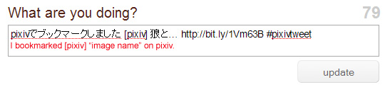 Now look what happens when you click on that Pixiv link! It takes you to Twitter and inserts a Tweet right into the text box for you. Man, that really works up a sweat! It’ll say (in Japanese) “I bookmarked [pixiv] xxxx on Pixiv” (“xxxx”  being the name of the image!) followed by a shortened link straight to the image page. If you want to you can replace it with English; I just leave it as is. Make sure you keep that #pixivtweet hashtag so the Twitter world can see that you’re Tweeting about the great and wonderful Pixiv!
