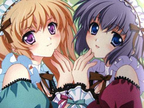 Here’s a double dose of girls with frilly dresses. The gal on the left was done for some kind of illustration collection and the group on the right was an illustration for a DVD that I don’t know the name of. (Sorry. I’m no help with the super-long-kanji titles…)