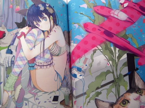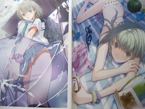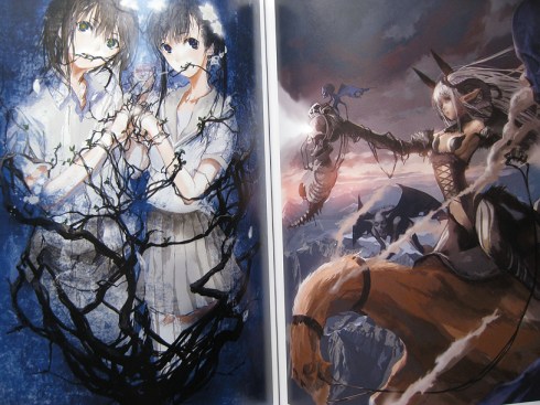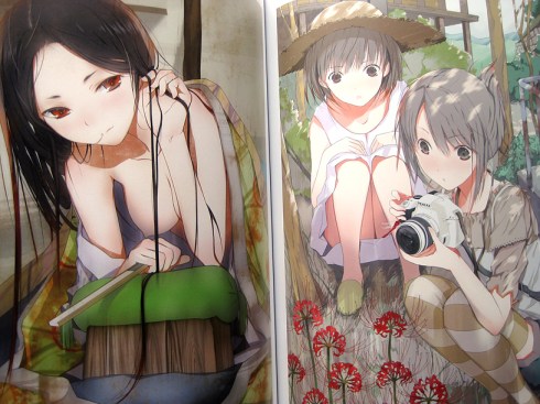 The whole book isn’t just super-moe pin-ups. There’s also some pretty detailed fantasy-style illustration going on! The 2 girls on the left page were used on the cover of an album called 燐音-RINNE- by MW. The right image was a guest illustration for a doujinshi called “ProgramDaemon“.