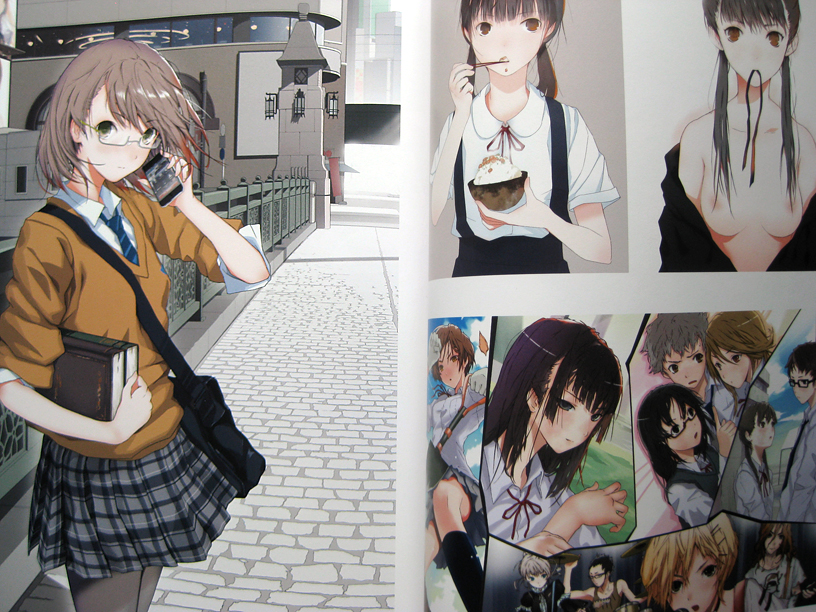 Fuyuno-sensei’s comment on the girl on the left is “This is Akihabara Mansei Bridge. Girl has iPhone3Gs. Her hobby is readng books. So she is waiting for iPad & iBooks !” (Source) She’s also in Techno Fuyuno’s 制服少女、私服 (Seifuku Shoujo, Shifuku) doujinshi, with commentary and a matching rough sketch. The varied illustrations of girls on the right were published in Dengeki Bunko magazine.