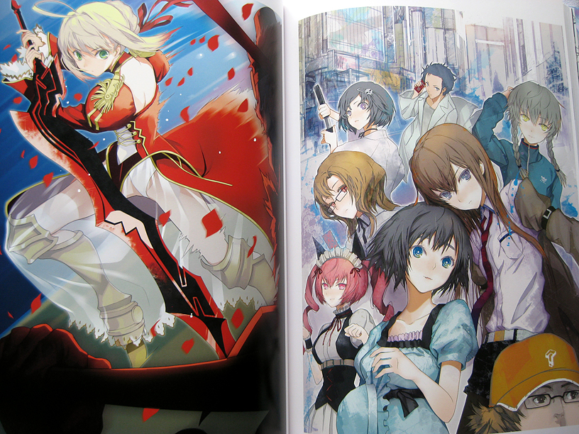 The book also has a really fantastic fanart section! The character on the left is Saber/Nero, colloquially as 赤セイバー “Red Saber” known from the PSP game Fate/Extra. This image in particular was a guest artwork featured in the Fate/Extra visual fanbook. The right image is a group shot of the characters from Steins;Gate.