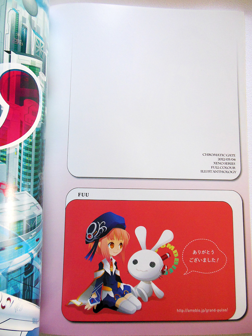 “Chromatic Gate” is an A4-sized, 94 page full-color collection of illustrations released in May of 2012 to celebrate the 10 year anniversary of Xenosaga episode 1. The book features art of characters from all of the “Xeno” titles, including Xenogears, Xenosaga and Xenoblade, by 44 different artists.