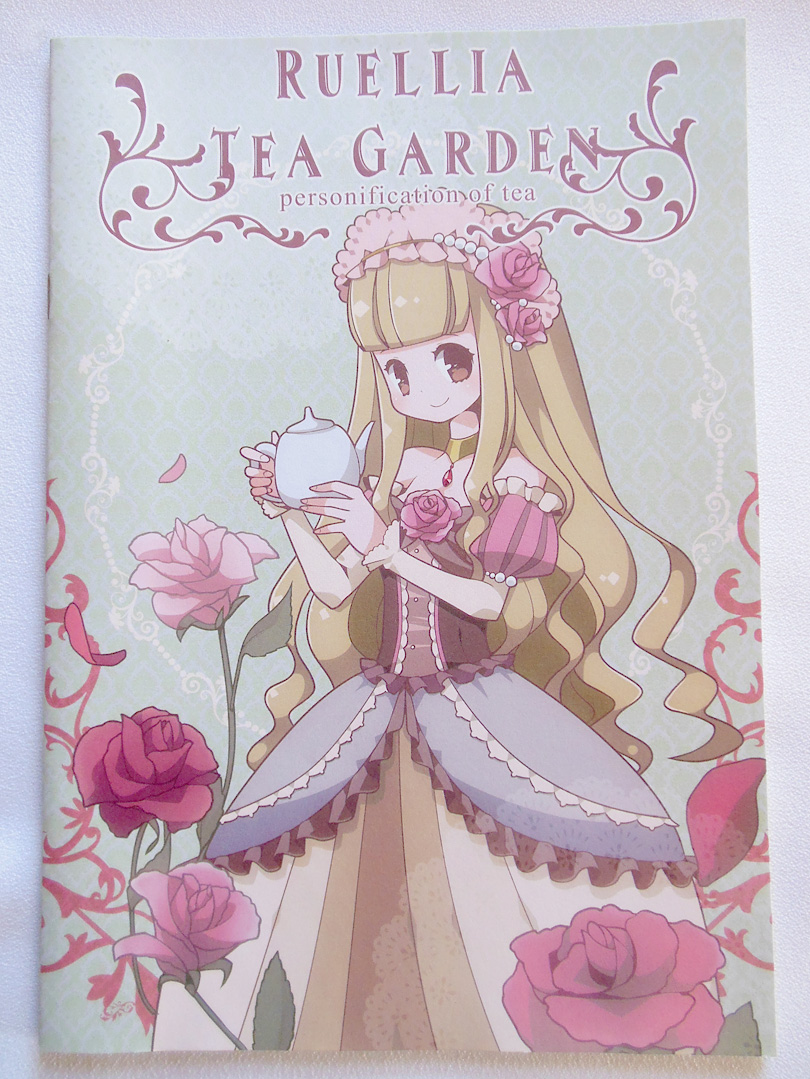 “Ruellia Tea Garden” is a B5-sized, 20 page full-color doujinshi by 斉藤アキ (Saitoh Aki) of the doujinshi circle “phanky berry beats“. A popular theme among Japanese artists is to create 擬人化 ( gijinka ) or anthropomorphized incarnations of popular objects, creatures or themes. Oftentimes, these anthropomorphizations are in the form of 萌え ( moe ) girls. This particular doujinshi does just that with tea, and presents each girl alongside facts about that particular type of tea.